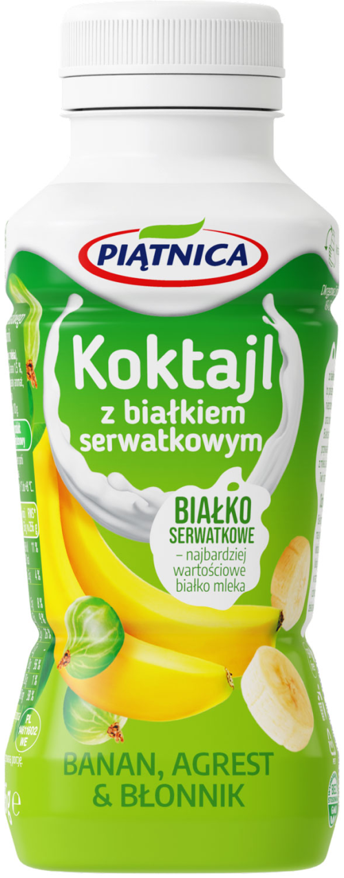 Koktajle z białkiem serwatkowym z Piątnicy to nowość na rynku. Dostępne są w 3 wariantach smakowych: Malina, granat i żeń-szeń, Mango, marakuja i owies oraz Banan, agrest i błonnik, a każda butelka zawiera aż 28 gramów białka serwatkowego. Jest go w mleku tak mało, że aby uzyskać 250 ml koktajlu, potrzeba aż 40 litrów mleka. Białko serwatkowe to prawdziwy cud natury!