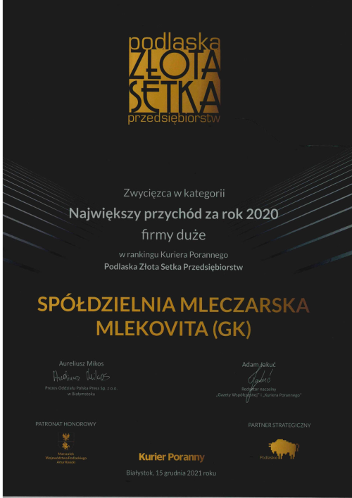 Grupa Mlekovita została również zwycięzcą XVIII Podlaskiej Złotej Setki Przedsiębiorstw wśród dużych firm o największych przychodach. To zwycięstwo zapewniła sobie, osiągając w 2020 roku rekordowe ponad 5,6 mld zł przychodu, mimo zawirowań związanych z pandemią Covid-19. Wartość eksportu firmy w 2020 r. wyniosła 1,6 mld zł, a wartość inwestycji – ponad 100 milionów zł. W ostatnim dziesięcioleciu Mlekovita zainwestowała w Polsce ponad 1 mld zł. Jesienią 2021 r. firma otworzyła największe i najnowocześniejsze centrum logistyczne w mleczarstwie, aby jeszcze sprawniej dystrybuować asortyment 1555 najwyższej jakości produktów, znanych w Polsce i w 167 krajach świata.