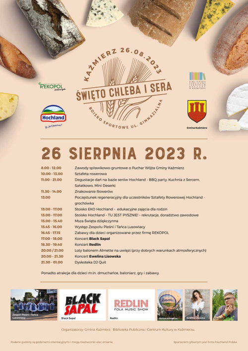 Święto Chleba i Sera to jedna z największych imprez odbywających się w Kaźmierzu. W tym roku wydarzenie zaplanowano na 26 sierpnia, a sponsorem głównym już tradycyjnie będzie firma Hochland Polska. Organizatorzy przygotowali mnóstwo wrażeń i atrakcji dla lokalnej społeczności oraz gości, którzy tego dnia odwiedzą tę podpoznańską gminę.